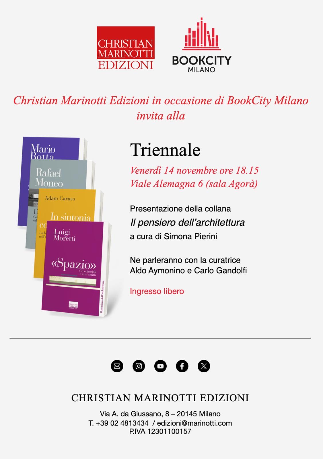 Il Collegio degli Ingegneri e Architetti di Milano vi invita alla presentazione della collana “Il Pensiero dell'Architettura” - edita da Christian Marinotti edizioni - il 14 novembre 2025, dalle 18:30, presso la Triennale di Milano.